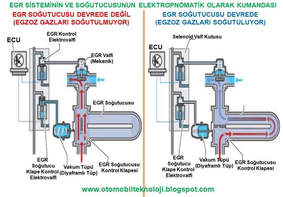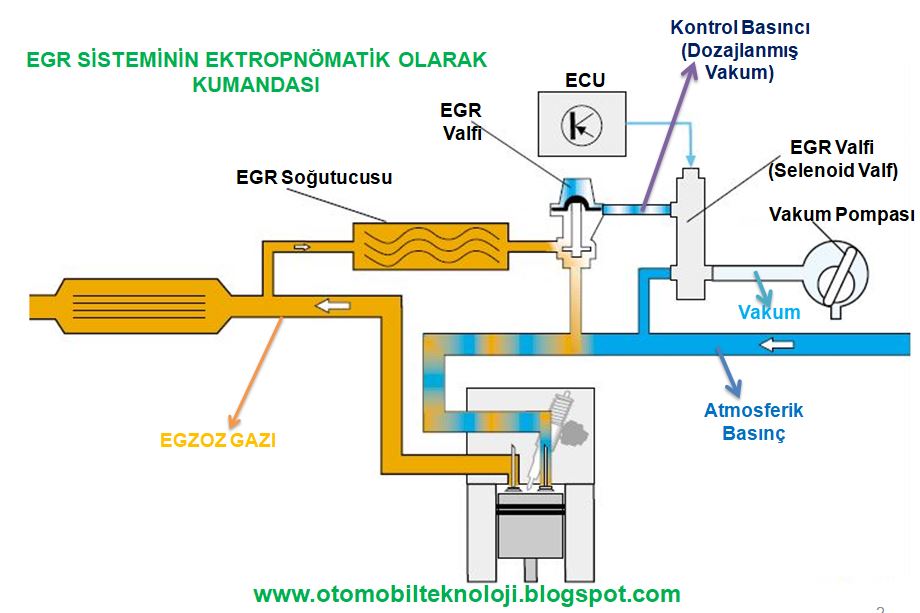 *Elektropnömatik (Selenoid Valfli) Kumanda: Benzinli araçlarda emme manifoldu vakumu, dizel araçlarda ise vakum pompasından etki ettirilen vakum, ECU kumandasında çalışan bir selenoid valf ile dozajlanarak, “diyaframlı vakum tüpüne” etki eder, böylece egr valfi hassas olarak açılır-kapanır.